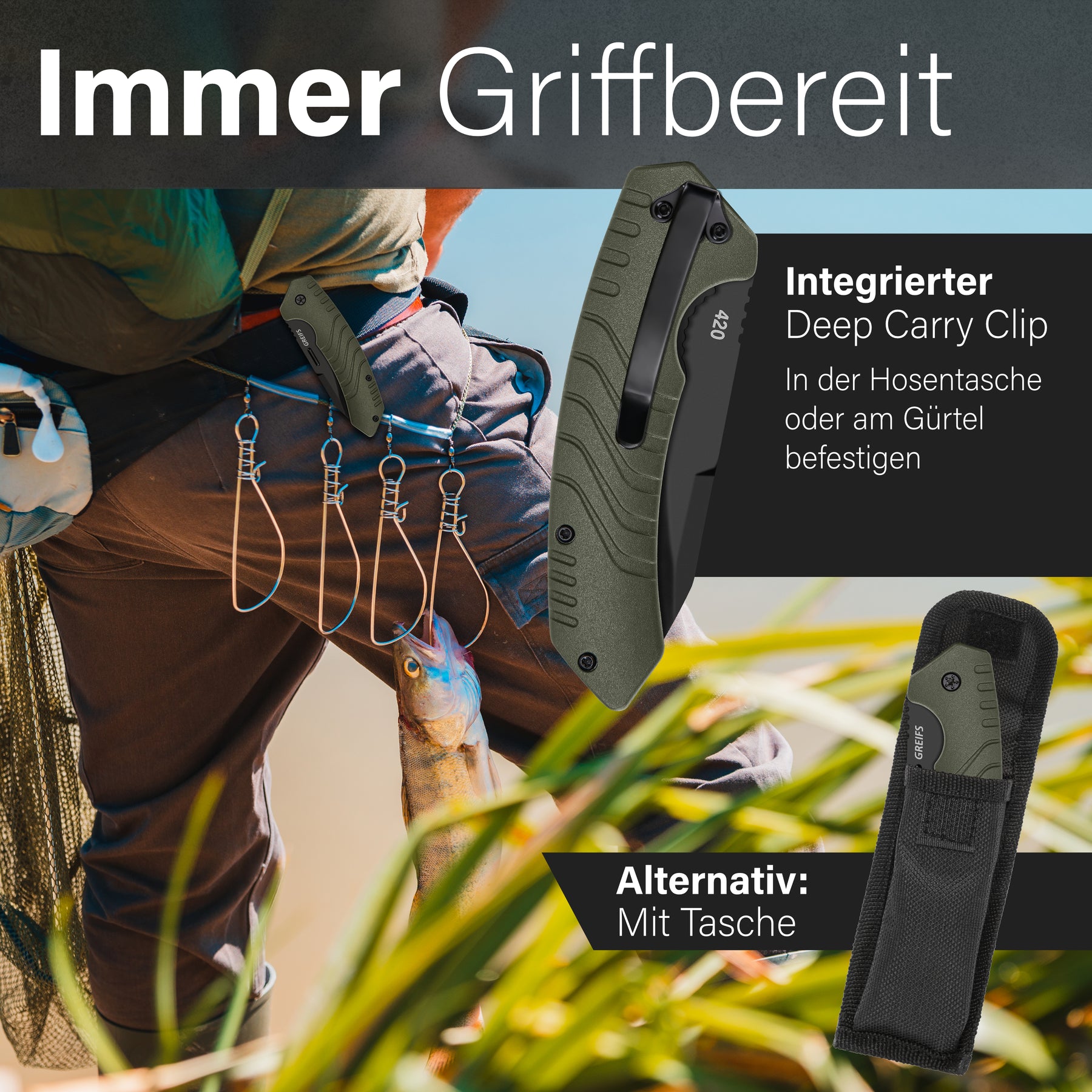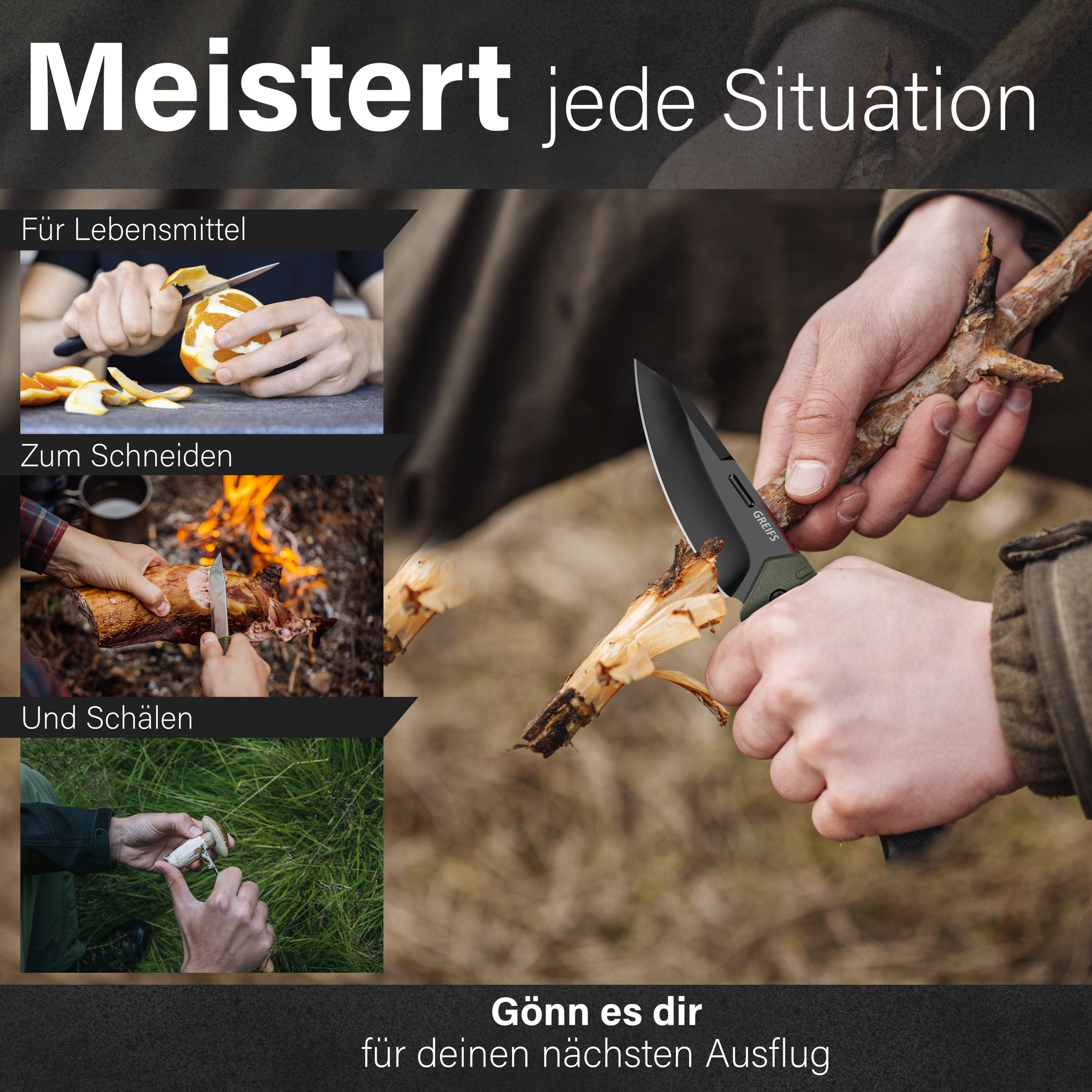 • 𝐇𝐞𝐫𝐯𝐨𝐫𝐚𝐠𝐞n𝐝𝐞 𝐐𝐮𝐚𝐥𝐢𝐭ä𝐭 𝐭𝐫𝐢𝐟𝐟𝐭 𝐞𝐝𝐥𝐞𝐬 𝐃𝐞𝐬𝐢𝐠𝐧 – Die scharfe Klinge aus robustem D2 Stahl und einen ergonomischen Griff aus hartem, faserverstärktem Nylon machen das Messer zum wahren Allrounder!