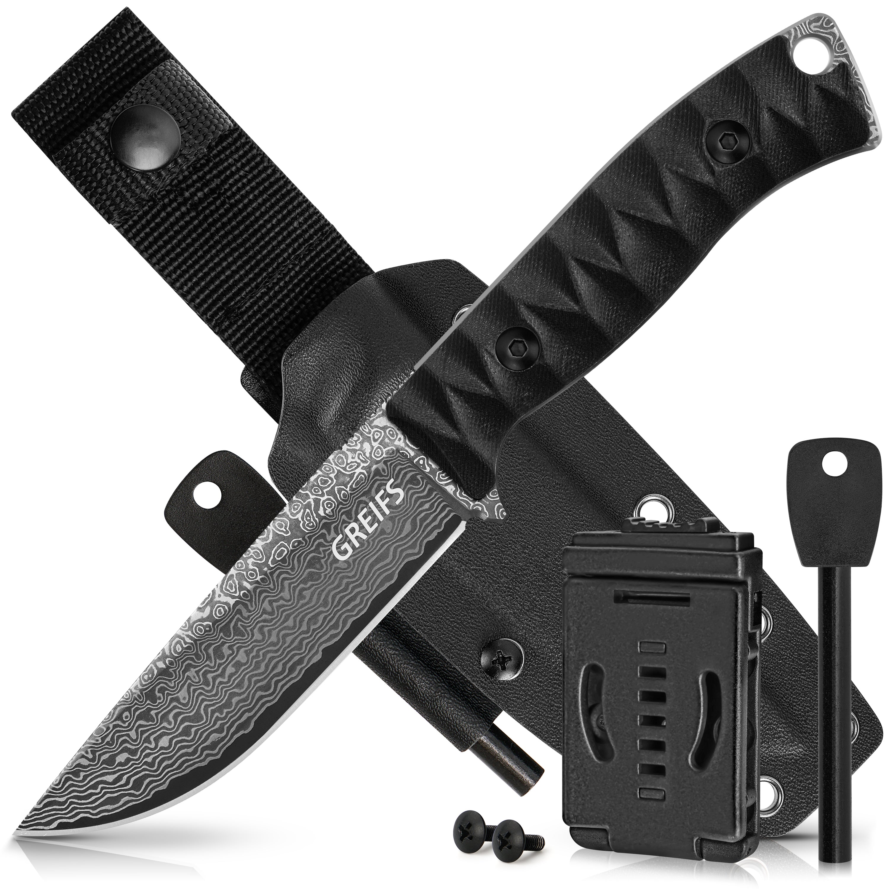 - 𝐎𝐔𝐓𝐃𝐎𝐎𝐑 𝐆𝐄𝐒𝐂𝐇𝐄𝐍𝐊 𝐒𝐄𝐓 – Du erhältst das Outdoor Messer mit Holster und Feuerstahl in einer edlen, schwarzen Geschenkbox.