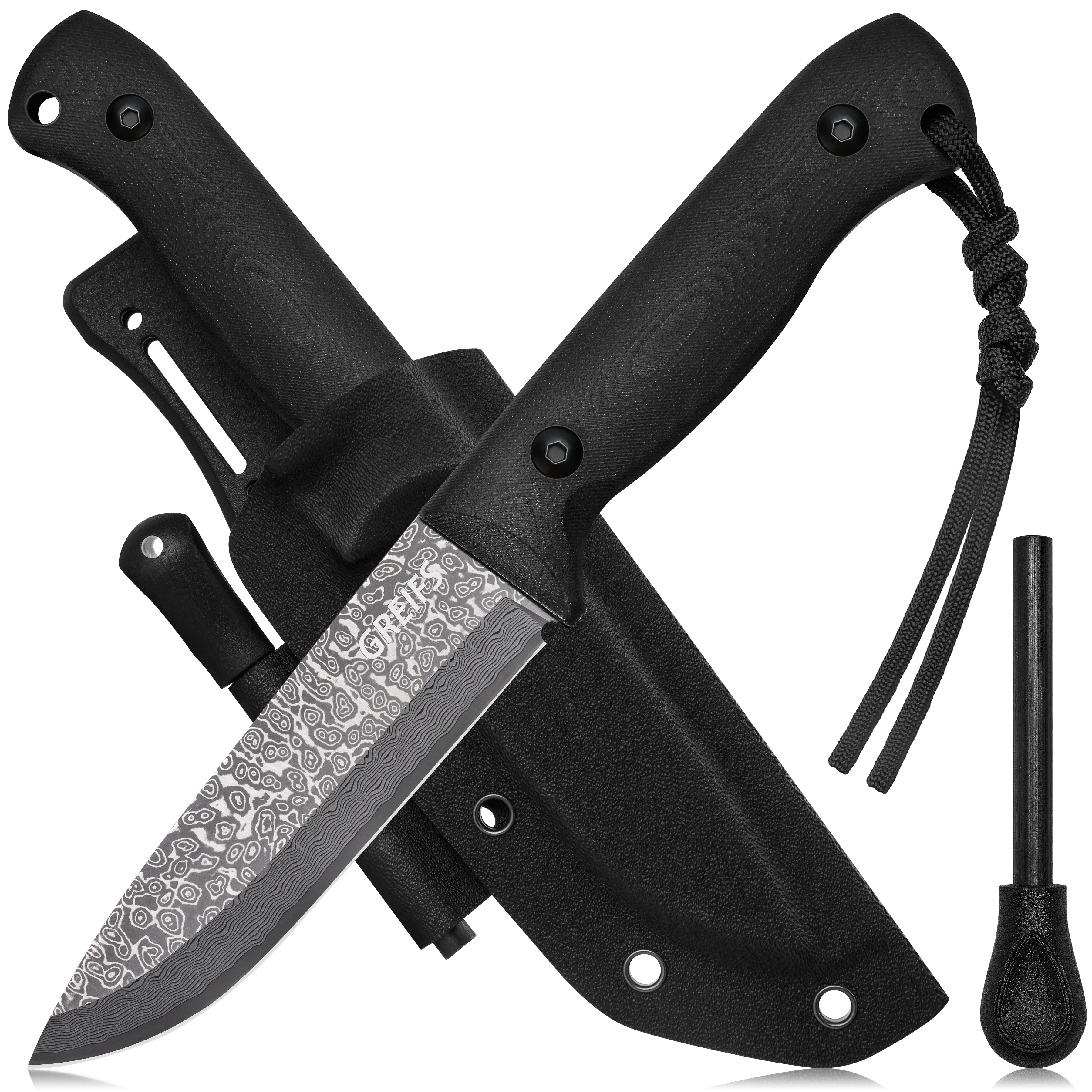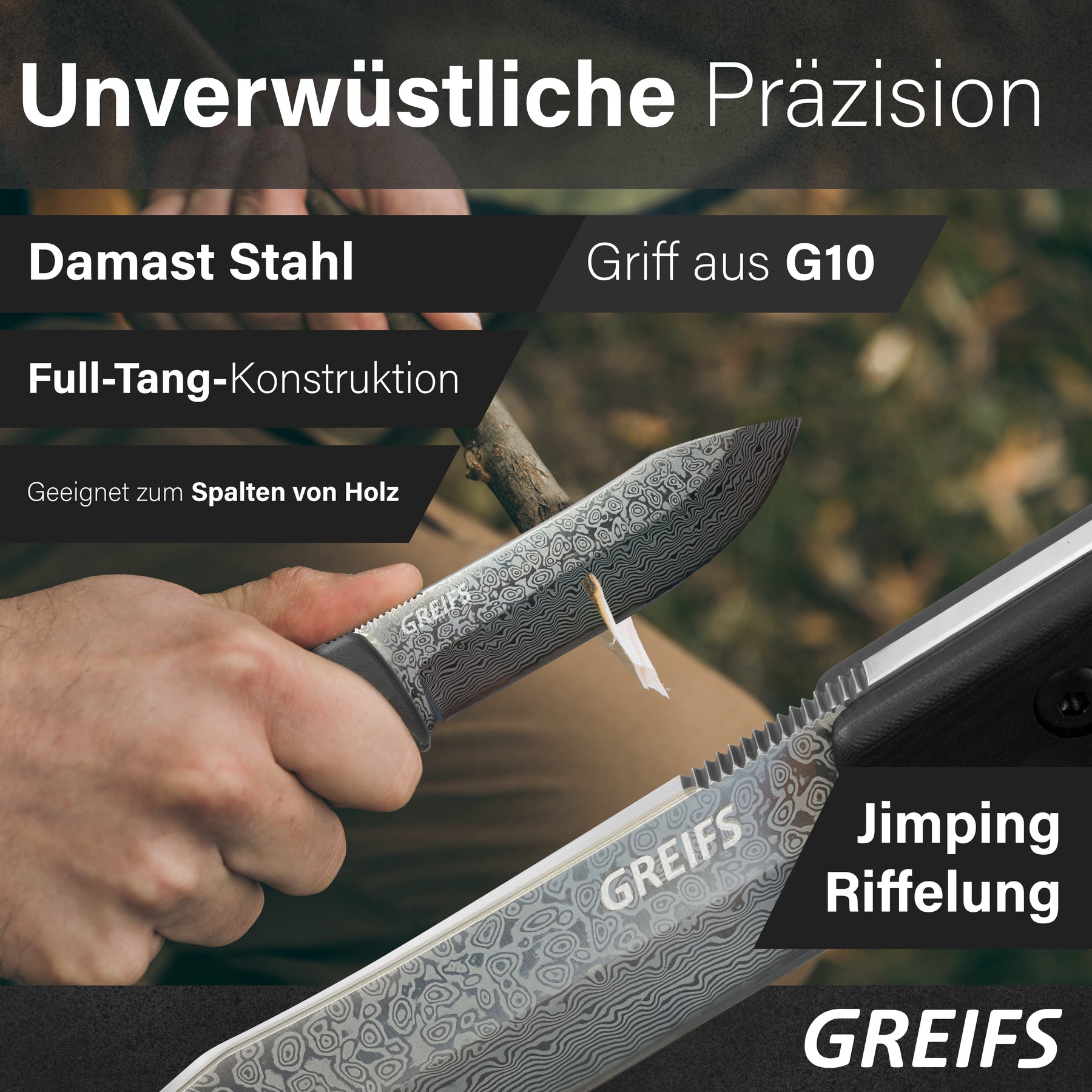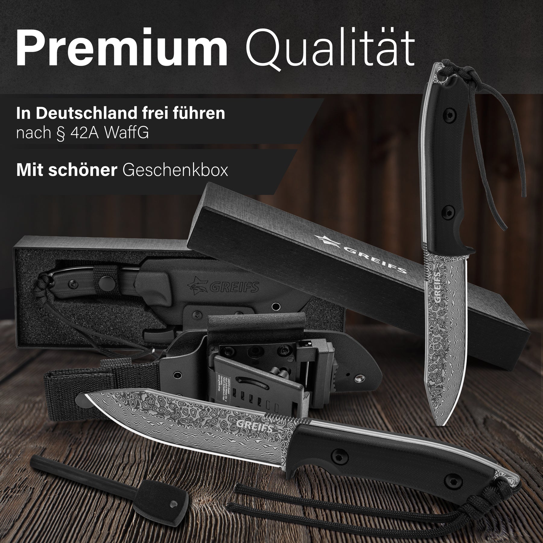 - 𝐏𝐑𝐄𝐌𝐈𝐔𝐌 𝐐𝐔𝐀𝐋𝐈𝐓Ä𝐓 – Die Klinge ist aus einem Stück durchgehenden Damast Spezialstahl gefertigt und der Griff besteht aus G10 Komposit Material. So entsteht ein unverwüstliches Messer das den härtesten Einsätzen standhält.
