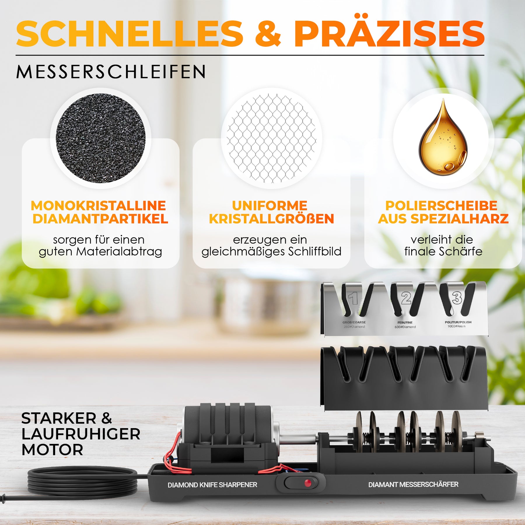 • 𝐒𝐜𝐡𝐥𝐮𝐬𝐬 𝐦𝐢𝐭 𝐬𝐭𝐮𝐦𝐩𝐟𝐞𝐧 𝐌𝐞𝐬𝐬𝐞𝐫𝐧 – Der elektrisch angetriebene 3 Stufen Vorgang Grobschliff, Feinschliff und Politur stellt die Schärfe deiner Messer im Handumdrehen wieder her. Erlebe ein professionelles Schärferlebnis in deiner Küche.